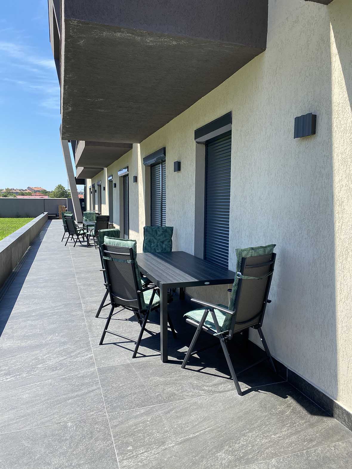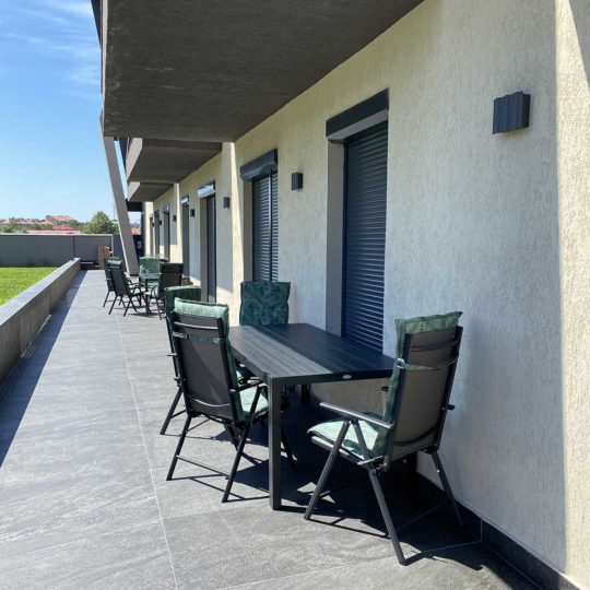 Vederea spre gradina este punctul forte al acestui apartament, conceput pentru iubitorii de relaxare. Terasa amenajata simplu si modern este rasfatul pe care ti-l dedicam, in fiecare zi insorita.